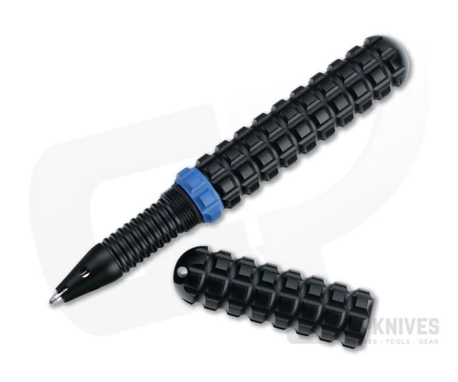 Finnish company Audacious Concept delivers a simple and rugged writing utensil in the Tenax Pen. The screw top has a hole for lanyard or key ring attachment making carry convenient. The aluminum body has a durable Type III anodization with a bright PMMA ring for easy identification and aggressive frag knurling for a sure grip. A blue glow dot insert opposite the cap makes low-light indexing a breeze. This version has a blue ring and black body.