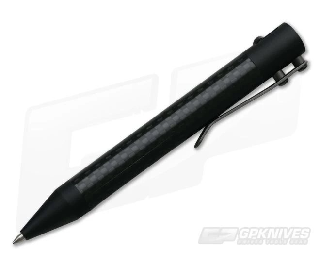 The new Carbon Fiber Boker Plus Tactical Defense Ink Pen K.I.D. CAL .50 with Black ink is the shorter more stout version of the CAL .45. The pen’s body is carbon fiber with titanium coated aluminum end caps. The “bolt action” mechanism with “click” open and close provide a unique smooth action. Includes a traditional stainless steel clip and takes Fisher Space Pen refills #PR4. Brand new direct from Boker.