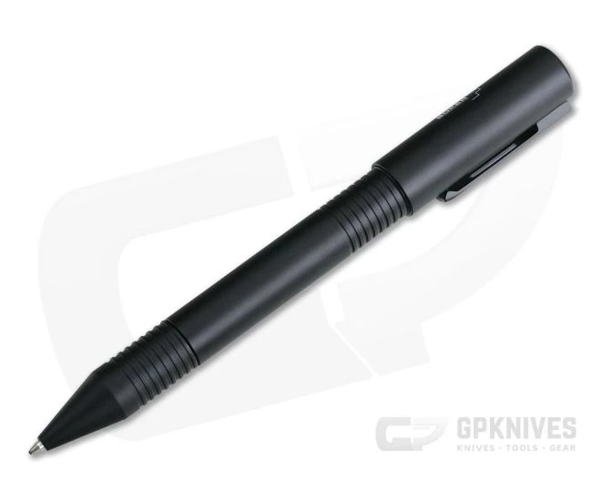 Designed by David Cyr and Kevin Passon, the Boker Plus Quill Commando Pen is a sleek, black aluminum bodied, twist-action ink pen with an integrated, multi-functional tool. The rear cap has a hidden pry tool and utility web cutter that allows this pen to open letters, remove staples and cut cable ties, cords etc. Made from milled aluminum for lightweight durability, the pen is discreetly black coated and milled with grooves for traction in the hand.