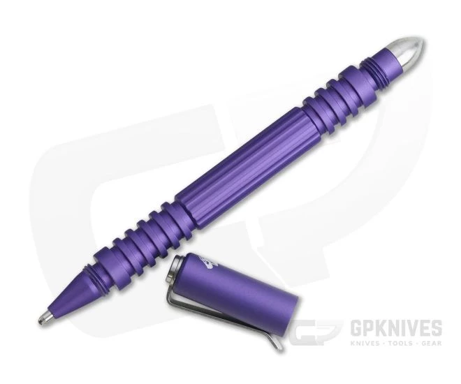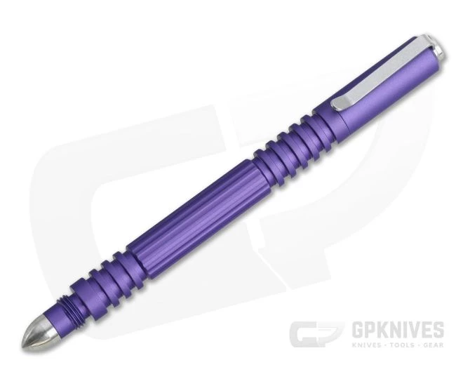 The Hinderer Knives Investigator Modular Pen is CNC machined from tough, lightweight, Aircraft Grade 6061-T6 Aluminum with milled grooves for traction and weight reduction. Threaded at both ends for cap retention, one side of the Investigator sports the black Fisher Space Pen tip for writing while the opposite end is outfitted with a modular stainless steel bullet end for more strenuous tasks. The end mounted stainless steel clip makes sure your pen is right there when you need it regardless of the task. This version comes with a matte Purple Anopeen hard coat finish. Uses Fisher Space Pen SPR4B refills.