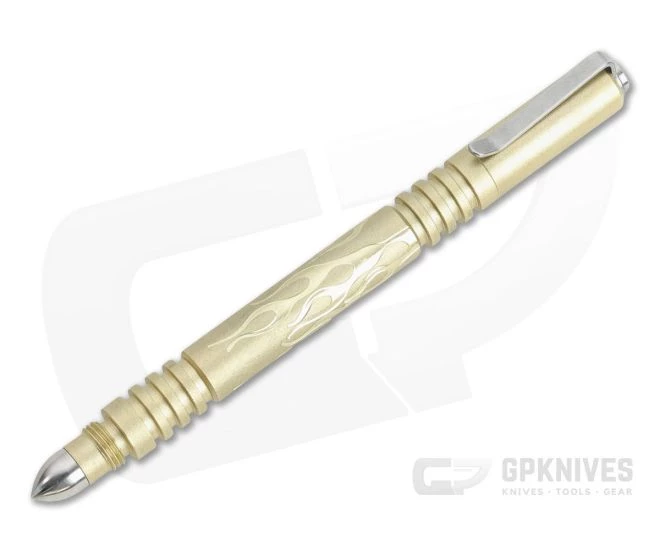 The Hinderer Knives Investigator Flames Modular Pen with Black Ink is crafted from CNC machined Brass for silky smooth operation. This version comes with a bead blast finish on the body for an orange peel like texture and milled polished flames instead of the standard fluting found on the body of the pen, delivering traction in style. Designed to be as small as a standard size refill would allow, yet usable in a tough situation the Investigator is lightweight yet overbuilt to take a beating…and give one thanks to the included modular, stainless steel Bullet End attachment while the end mounted stainless steel clip delivers secure, discreet carry.