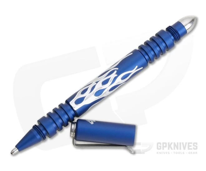 The Hinderer Knives Investigator Flames Modular Pen with Black Ink is crafted from CNC machined Aircraft Grade 6061-T6 Aluminum with a Matte Blue Anopeen, hard anodized finish. This version comes with milled silver flames instead of the standard fluting found on the body of the pen, delivering traction in style. Designed to be as small as a standard size refill would allow, yet usable in a tough situation the Investigator is lightweight yet overbuilt to take a beating…and give one thanks to the included modular, stainless steel Bullet End attachment while the end mounted stainless steel clip delivers secure, discreet carry.