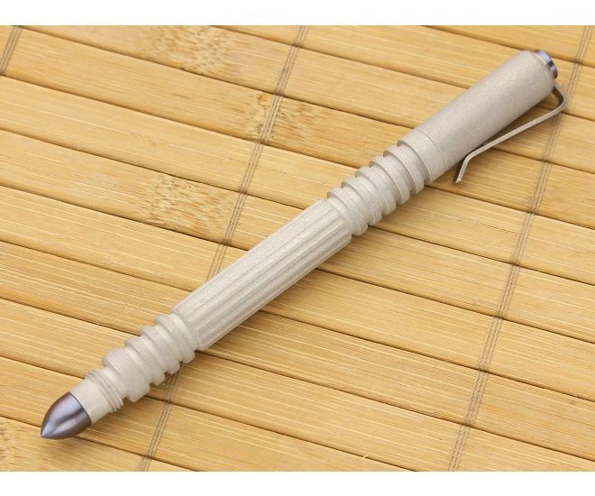 The Hinderer Aluminum Investigator Ink Pen is a compact and lightweight pen right at home in a professional setting. The Investigator was strategically built to have a small, unassuming stature while still offering a reasonable grip for striking situations, should one arise. Deep grooves around the front and back end combined with understated longitudinal grooves in the middle provides just the right amount of purchase for everyday writing tasks or less frequent striking motions. Built with modular construction, the blue anodized small bullet attachment can be removed to refill ink and replaced with one of Hinderer’s accessory options, such as the warhead or flat end attachment. Attractive blasted raw aluminum finish with blue titanium accenting hardware. Stainless steel clip attached and screw on cap help to keep this pen with it’s person. Black Ink. Brand new directly from Hinderer Knives.