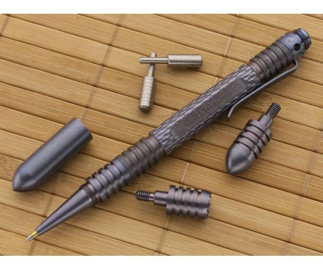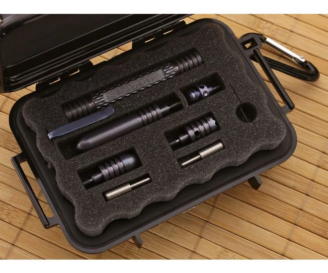 The Rick Hinderer Modular Kubaton Deluxe Set in Blue anodized tumbled Titanium is the complete package. Everything you need to construct your pen or kubaton in a custom foam cut Pelican 1020 case. This set includes the following… Modular Kubaton Body Pen Attachments Bullet Attachment Short Strike Attachment Titanium Pocket Clip Two Torque Tightening Pins Pelican Waterproof Case With Custom Cut Foam Mini Allen Key