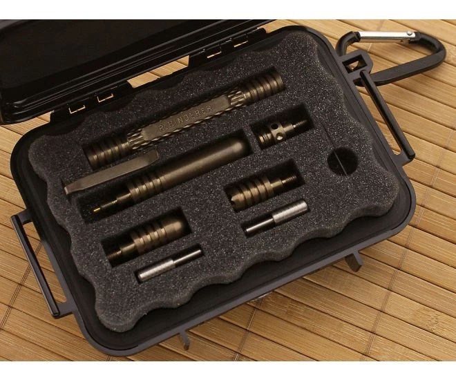 The Rick Hinderer Modular Kubaton Deluxe Set in Bronze Anodized Titanium is the complete package. Everything you need to construct your pen or kubaton in a custom foam cut Pelican 1020 case. This set includes the following… Modular Kubaton Body Pen Attachments Bullet Attachment Short Strike Attachment Titanium Pocket Clip Two Torque Tightening Pins Pelican Waterproof Case With Custom Cut Foam Mini Allen Key