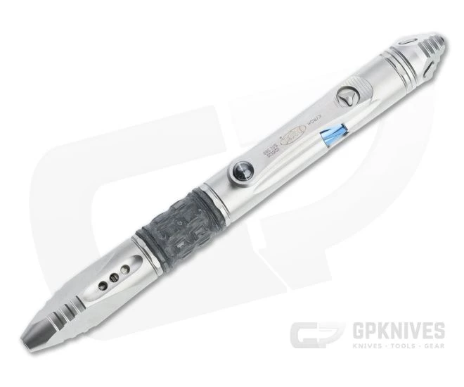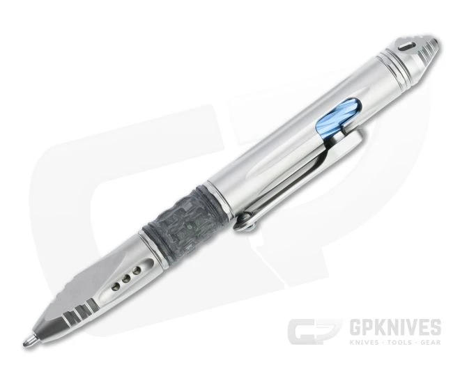 The Kyroh Mini bolt action delivers a compact, tactical daily carry pen with Microtech’s singular style. A fluted titanium body with textured carbon fiber sleeve offers a tool with solid heft, good grip and looks to spare. A tungsten glass breaker makes this a multifunctional writing implement with tritium vial insert for low light indexing. The sturdy milled clip doubles as the bolt slide delivering fluid operation. The shorter length of the Mini makes for favorable carry. This version has a bead blasted titanium body and blue anodized fluted bolt.