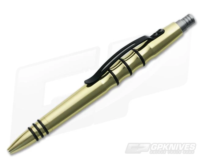 This “clicky” tactical pen features body and tip machined out of solid brass. The body of the pen has been comfortably contoured and also has removable black Duron O-rings for a secure grip. The click-action on the pen features a two piece ball bearing-cam design which offers silky smooth action and almost eliminates the “click” sound.