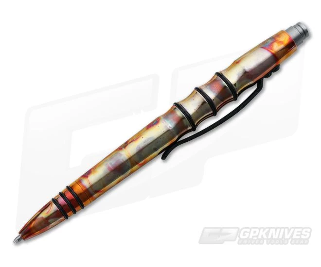 This “clicky” tactical pen features body and tip machined out of solid copper, which has been torched to bring out a vivid multi color finish. The body of the pen has been comfortably contoured and also has removable black Duron O-rings for a secure grip.